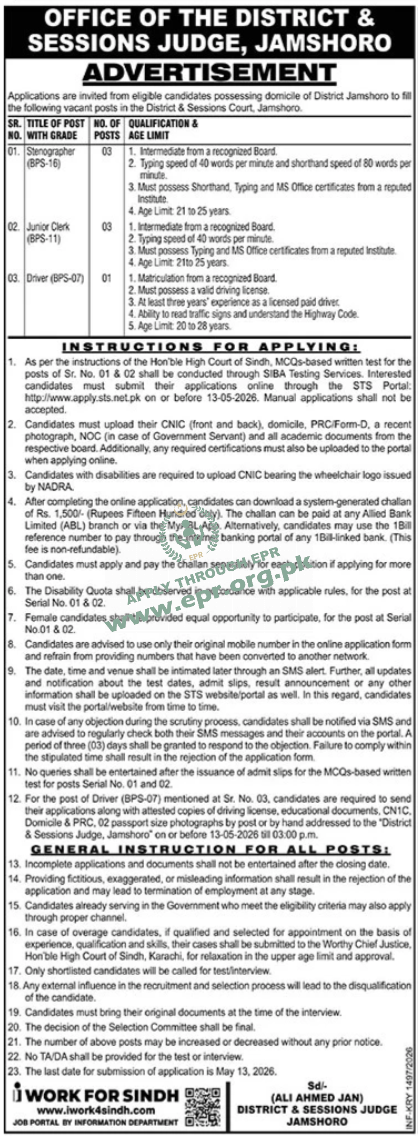 District and Sessions Judge Jamshoro jobs 2026 · Stenographer BPS-16 Jamshoro shorthand 80 WPM typing 40 WPM · Junior Clerk BPS-11 Jamshoro typing 40 WPM MS Office · Driver BPS-07 Matric valid driving license 3 years experience · Intermediate required Stenographer Junior Clerk · MS Office certificates reputed institute · Shorthand certificate required · Typing certificate required · Age limit 21-25 years Stenographer Junior Clerk · Age limit 20-28 years Driver · Domicile District Jamshoro required · STS application portal apply.sts.net.pk · Application fee Rs 1500 Allied Bank MyBLA 1Bill · Separate challan multiple posts · Disability quota · Female candidates equal opportunity · PRC Form-D required · NOC government employees · Original mobile number required · Admit slips STS website · Driver application by post or by hand · Two passport size photographs Driver · May 13 2026 deadline · iWork4Sindh job portal