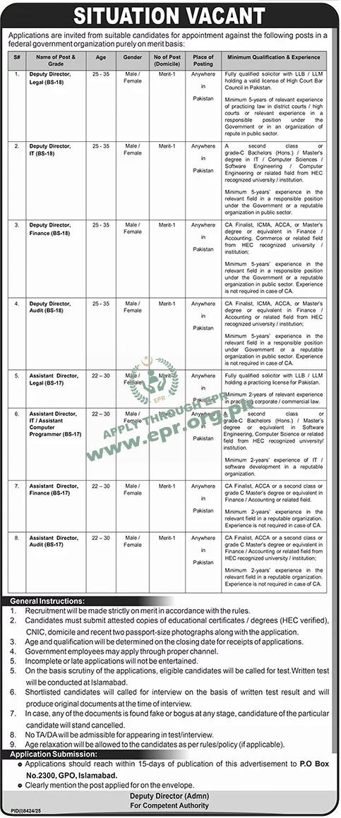 A Federal Government Organization invites applications for multiple positions on a regular, merit basis. The organization operates across Pakistan and seeks qualified professionals in Legal, IT, Finance, and Audit. This is an excellent opportunity for candidates with LLB/LLM, CA, ACCA, ICMA, Computer Science, or Software Engineering qualifications. Both Deputy Director (BS-18) and Assistant Director (BS-17) positions are available. The application deadline is 15 days after publication — apply immediately.