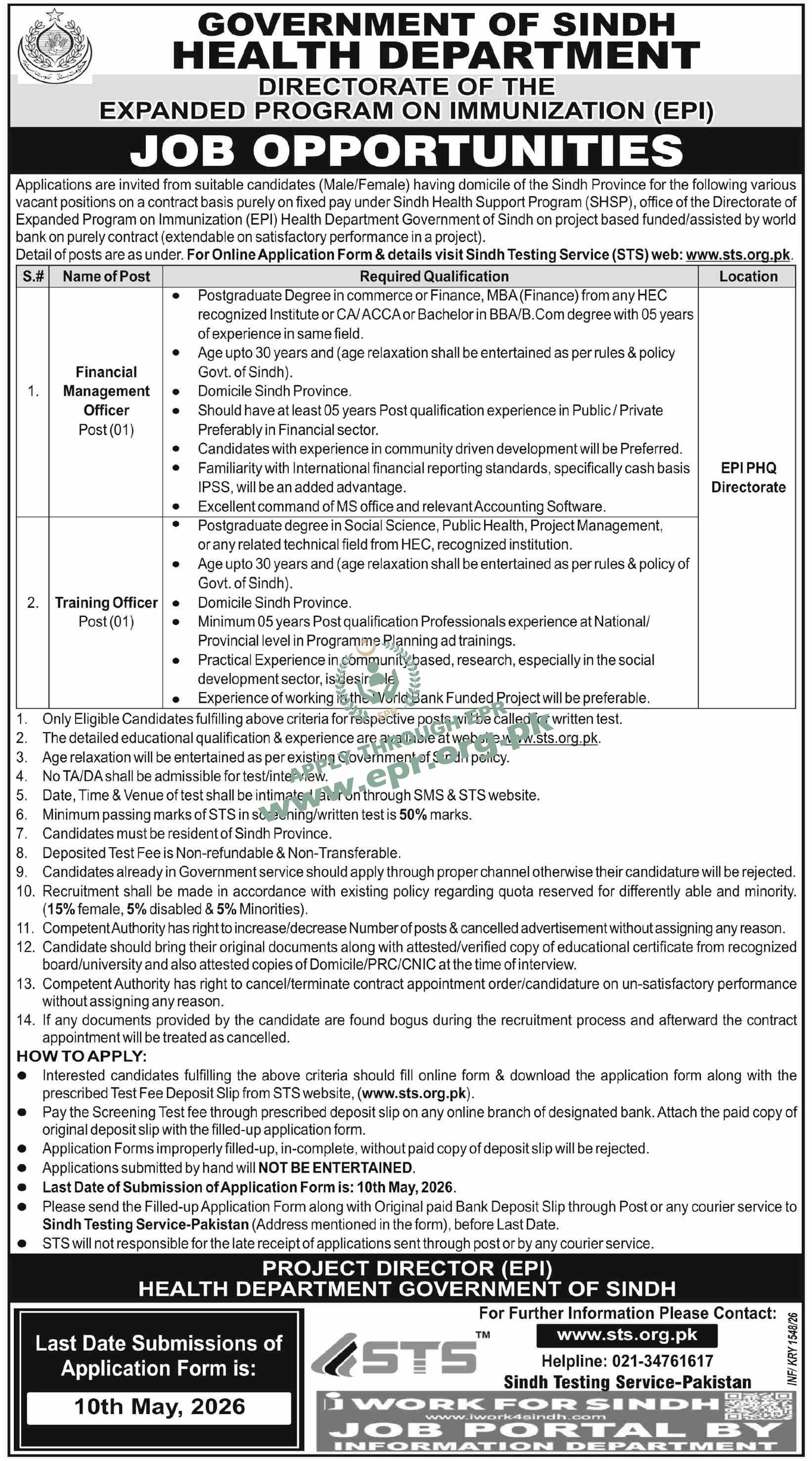 EPI Sindh jobs 2026 · Expanded Program on Immunization Health Department Sindh · Financial Management Officer postgraduate commerce finance MBA · Training Officer public health project management · World Bank funded project Sindh Health Support Program · SHSP · 5 years experience financial sector · IPSAS international financial reporting standards · MS Office accounting software · Programme planning trainings national provincial level · Community based research social development · STS screening test 50% passing marks · Sindh domicile required · 15% female quota 5% disabled quota 5% minorities quota · Apply online www.sts.org.pk · Send application by post courier STS · No hand delivery · Original documents at interview · Government employees need NOC · Fixed pay contract basis extendable · EPI PHQ Directorate location · Age up to 30 years with relaxation · May 10 2026 deadline · iWork4Sindh job portal
