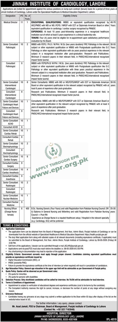 Jinnah Institute of Cardiology Lahore jobs 2026 · Medical Director cardiology cardiac surgery 10 years fellowship · Senior Consultant Pathologist FCPS PhD MPhil · Consultant Interventional Cardiologist MD MS FCPS · Senior Consultant Cardiac Surgery 6 positions · Consultant Cardiac Anesthesia · Consultant Electrophysiology ACHD Cardiac Rehab · Consultant Radiology Nuclear Medicine · Nursing Officer Charge Nurse female BSc Nursing Diploma · 400 Nursing Officer positions · 2 research papers HEC recognized journals · PMDC recognized qualification · HEC equivalence certificate · Age relaxation Punjab government policy · 5% minority quota 3% disability quota · Lump sum contract basis 3 years · Apply Board of Management PIC Lahore · Email JICLHR@punjab.gov.pk · Last date May 8 2026 2pm · Post fellowship experience · Clinical leadership role · FCPS MRCP CCT Diplomate American Board · Cardiology ICU charge nurse experience · Punjab Institute of Cardiology Admin Block · Specialized Healthcare and Medical Education Department