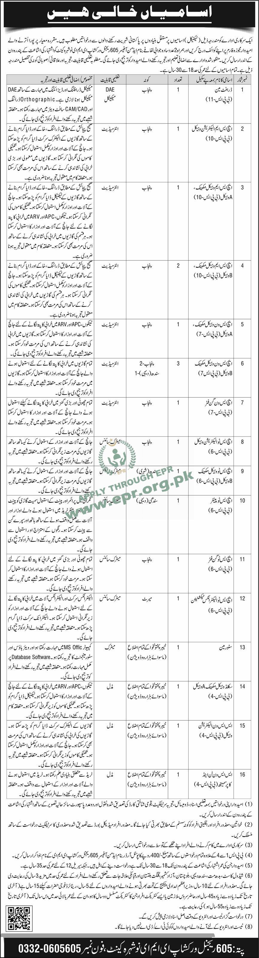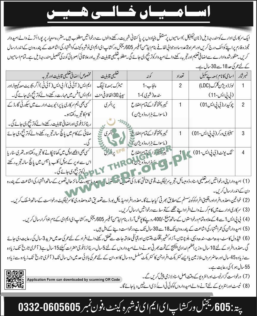 #605RegionalWorkshopEME #NowsheraCanttJobs #DraftsmanJobs #VehicleMechanic #ElectricianJobs #GunFitter #PainterJobs #ElectronicsTechnician #StoremanJobs #LDCJobs #ChowkidarJobs #SanitaryWorker #SangJobs #KPKJobs #GovernmentJobsPakistan #PermanentJobs #AgeRelaxation #RetiredMilitaryJobs #Deadline15Days #NowHiring