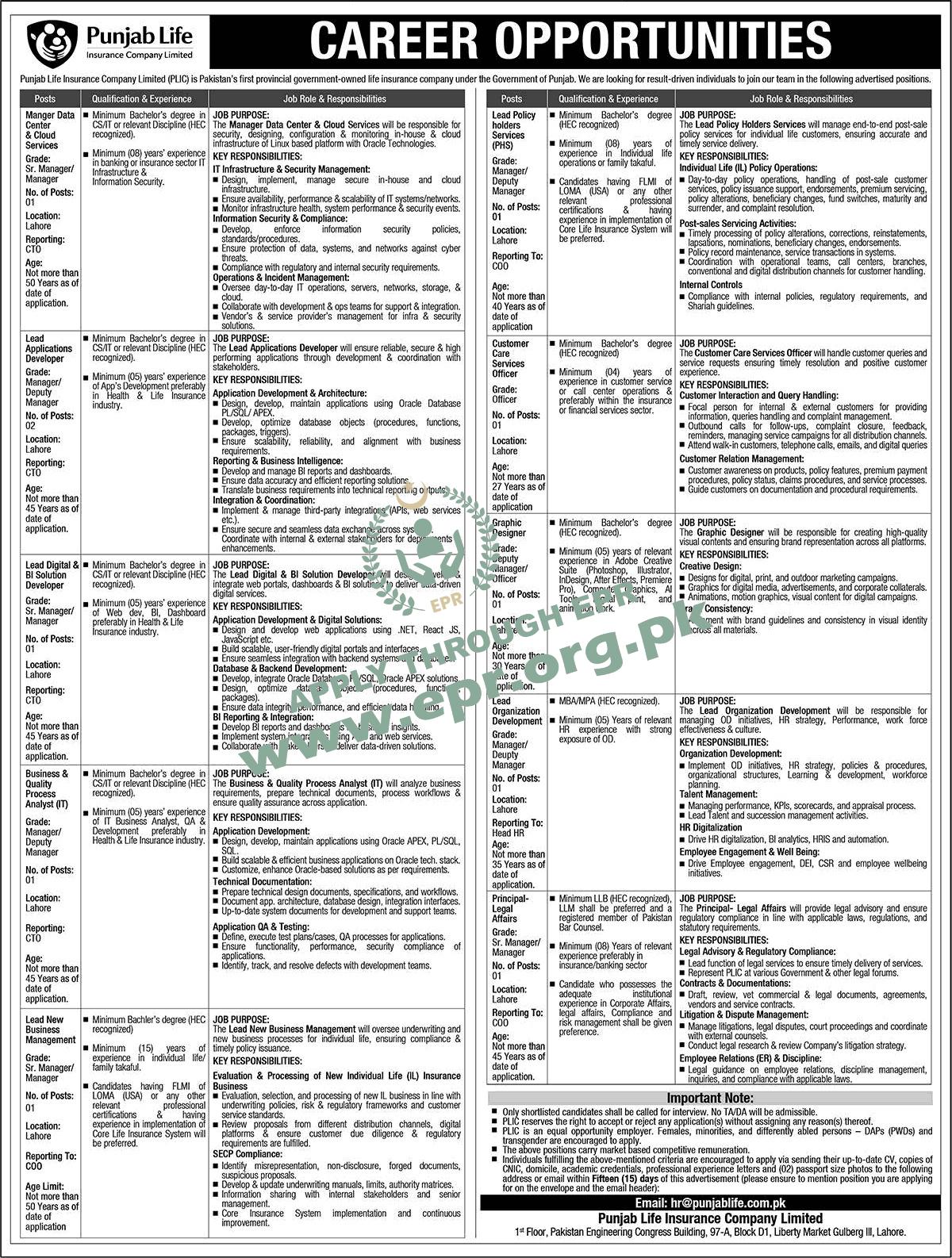 Punjab Life Insurance Company jobs 2026 Lahore · PLIC careers · Manager Data Center Cloud Services 8 years · Lead Applications Developer Oracle PL/SQL APEX · Lead Digital BI Solution Developer .NET React JS · Business Quality Process Analyst IT Oracle APEX QA · Lead New Business Management underwriting 15 years FLMI · Lead Policy Holders Services 8 years · Customer Care Services Officer 4 years · Graphic Designer Adobe Creative Suite AI tools · Lead Organization Development MBA 5 years · Principal Legal Affairs LLB LLM insurance banking · HEC recognized degree · Market based competitive remuneration · Liberty Market Gulberg Lahore · Apply email hr@punjablife.com.pk · Mention position in subject line · Two passport size photos required · 15 days deadline · Females minorities PWDs transgender encouraged · Equal opportunity employer