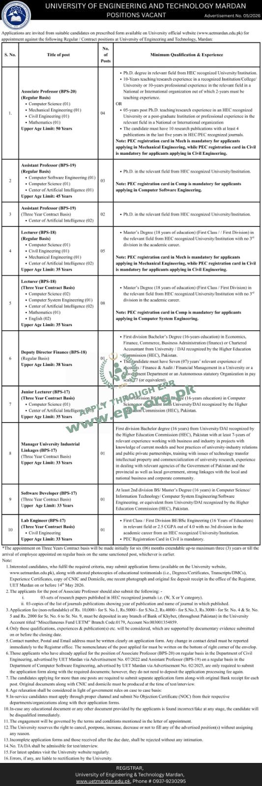 UET Mardan jobs 2026 · Associate Professor Computer Science Mechanical Civil Mathematics · Assistant Professor Computer Software Engineering AI · Lecturer Civil Computer Science Mechanical AI Computer System Engineering Mathematics English · Deputy Director Finance BPS-18 7 years experience · Junior Lecturer Center of Artificial Intelligence · Manager University Industrial Linkages 7 years experience · Software Developer BPS-17 BS CS IT · Lab Engineer Civil Engineering PEC registered · Ph.D. required for Associate Assistant Professor · Master degree 18 years education first class · PEC registration mandatory engineering · 10 research publications Associate Professor · HEC recognized university degree · No 3rd division academic career · Bank of Khyber account deposit · Application fee Rs 10000 to 2000 · Previous applicants 2022 2025 no fee · Separate application each post · NOC in-service candidates · Age limit 50-33 years · Contract basis 3 years or till regular · Regular basis permanent · Apply by May 14 2026 · Mardan KPK university careers